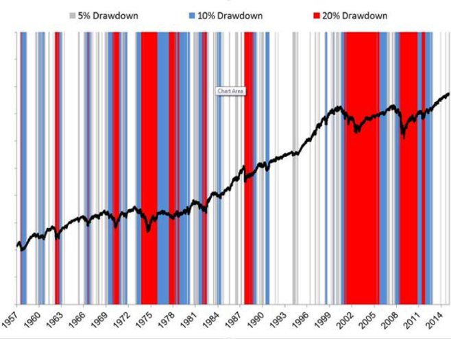 The chart below from my friend Michael Batnick at Ritholtz Wealth Management, paints this picture nicely. Notice how much of the time the stock market has spent in either a 5%, 10%, or 20% drawdown. And yet from 1957-2014, for those disciplined investors willing to ride out these drawdowns, the market has returned 10.2% annually—turning $1,000 investment into more than $250,000! What matters for the disciplined investor is again, “time in the markets, not timing the markets.”
